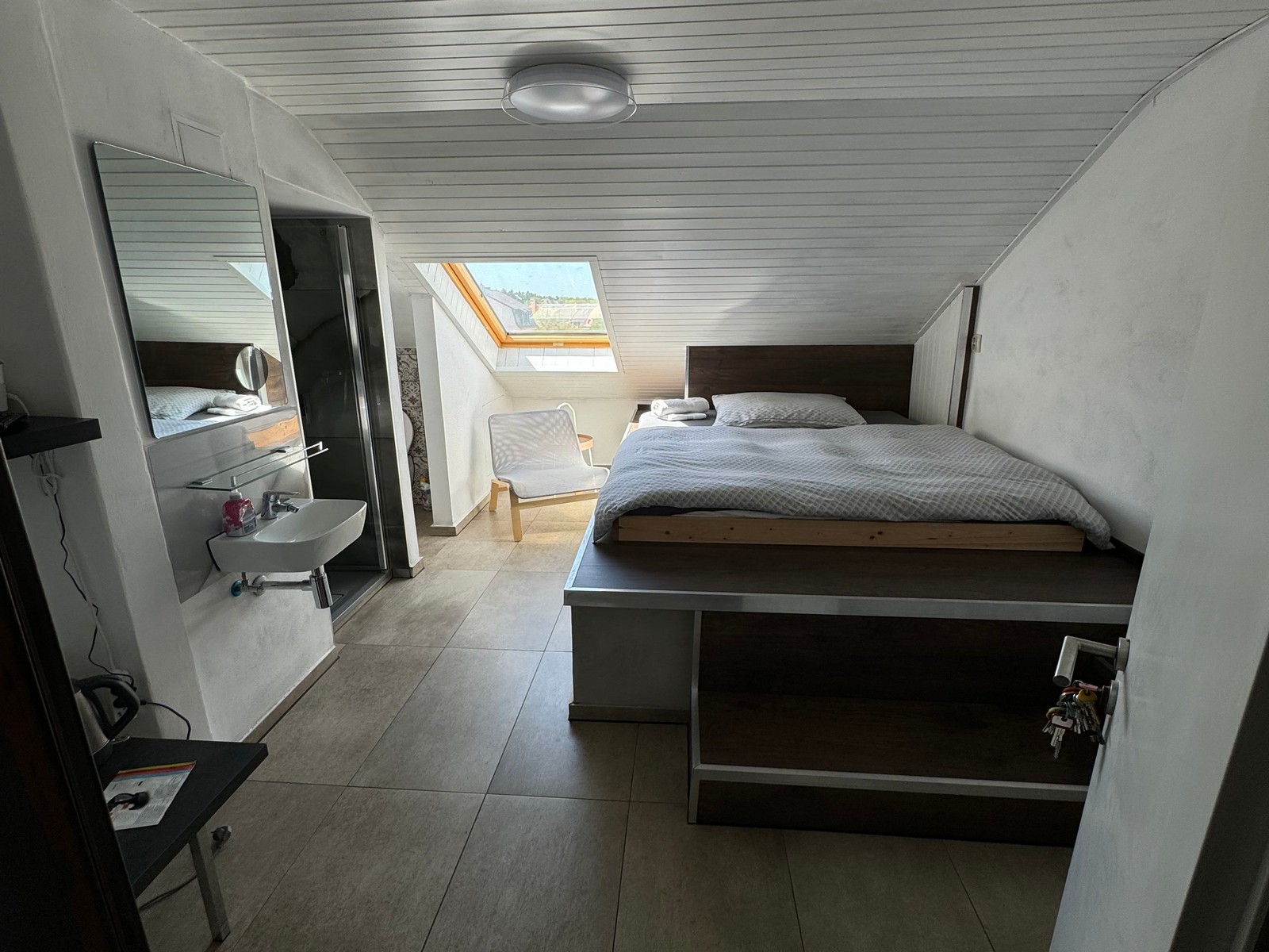 Sprcha, Ručníky, Povlečení, Čisticí prostředky, Lednička, Rychlovarná konvice, Skříň, Toaletní papír.